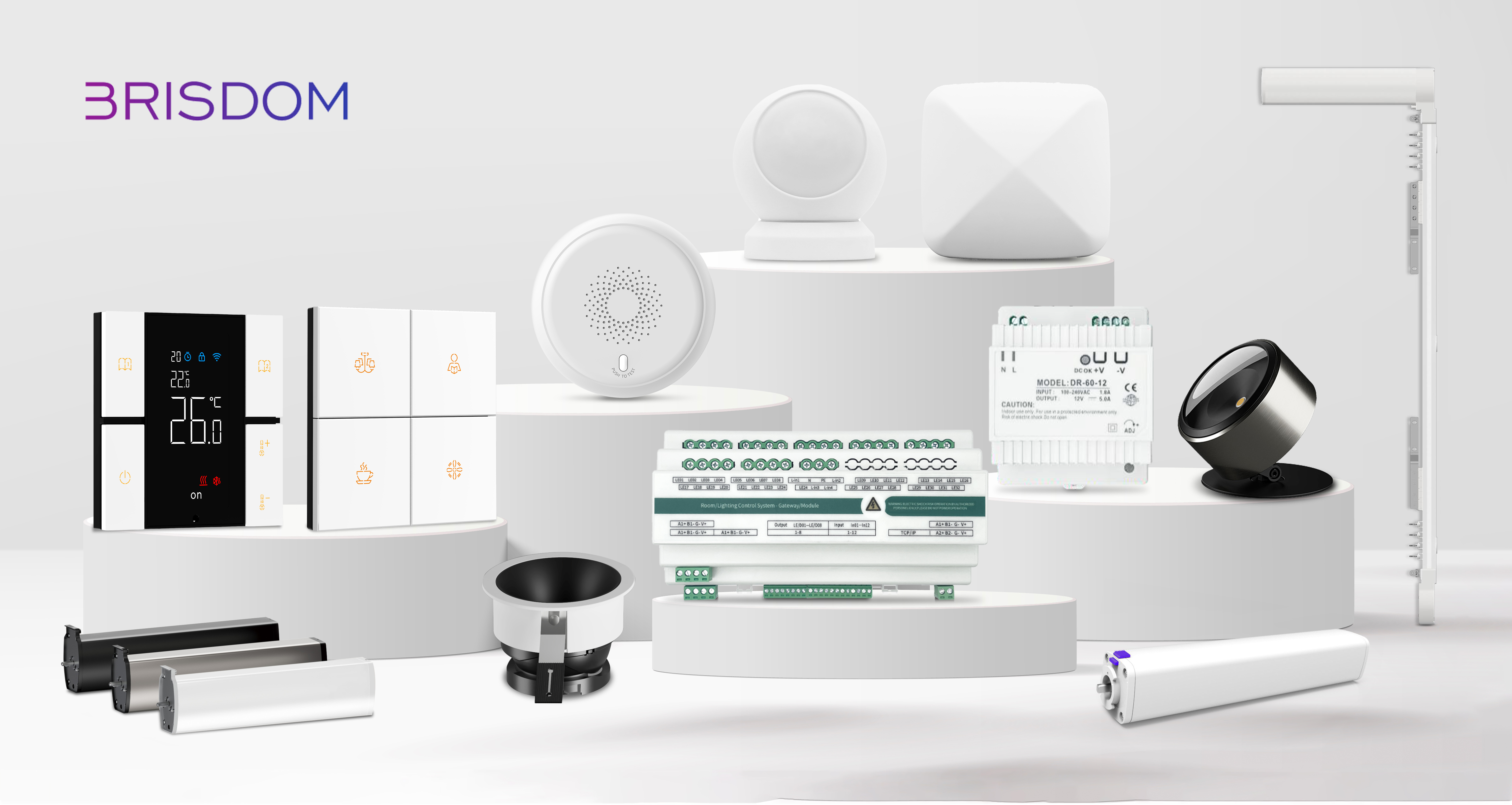 Brisdom provides All-in-One smart control solutions including RS485 wired systems and Zigbee wireless systems. The system integrates RCU/gateways, smart panels, intelligent lighting, and curtain motors, all managed via user-friendly guest room control software. Solutions cover star-rated hotels, budget hotels, hotel apartments, serviced apartments, and dormitories.